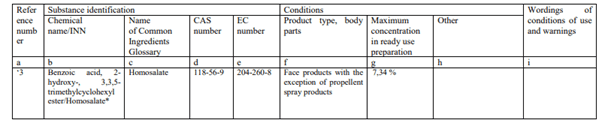 - INCI adı Homosalate olan Benzoik asit, 2-hidroksi-, 3,3,5-trimetilsikloheksil ester (CAS No.118-56-9), 1223/2009 numaralı yönetmeliğin Ek VI 3. girdide listelenmiştir ve bu nedenle kozmetik ürünlerde UV filtresi olarak kullanıma hazır ürünlerdeki maksimum %10 konsantrasyonda kullanılmasına izin verilir.