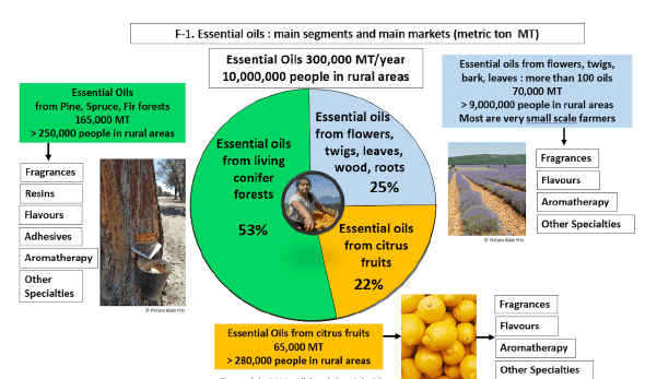 Esansiyel yağlar genellikle parfümlerde (yılda 125.000 MT), ardından aromalarda (yılda 65.000 MT), farmasötiklerde (yılda 40.000 MT) kullanılır ve kalan 70.000 MT’lik kısım (çoğunlukla orman esansiyel yağları) reçineler, yapıştırıcılar ve mürekkepler gibi yenilenebilir özel ürünlerde kullanılır.