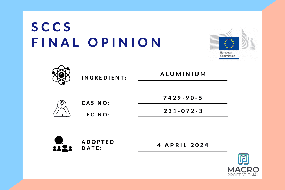 SCCS, 4 Nisan 2024 tarihinde SCCS/1613/19, SCCS/1626/20 ve SCCS/1644/22’de sunulan sonuçları incelemesinin ardından Aluminum bileşeninin kozmetik ürünlerde güvenliği ve uygun kullanımına ilişkin nihai görüşünü yayınlamıştır.