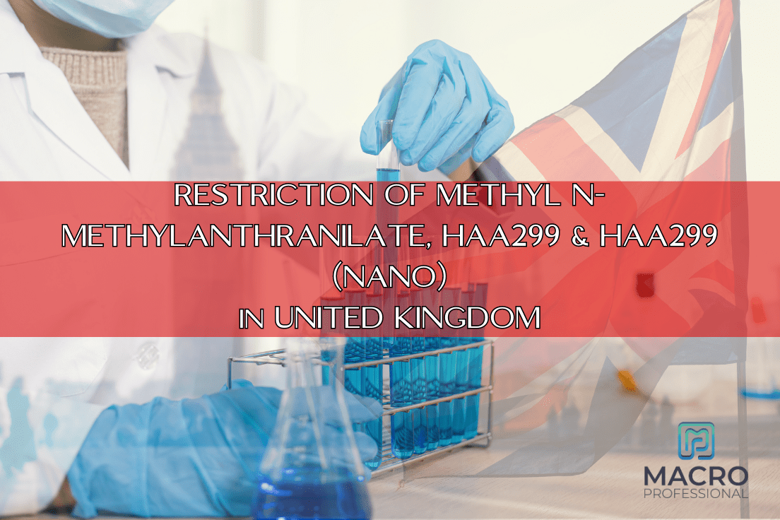 6 Temmuz 2023 tarihinde Birleşik Krallık, Kozmetik Yönetmeliği 1223/2009’da, 3 bileşen için izin verilen kullanım konsantrasyonları için değişiklikler yayınlamıştır. Bu bileşenler, kozmetik ürünlerde kullanılan Methyl-N-methylanthranilate, HAA299 ve HAA299 (nano)’dur. Methyl-N-methylanthranilate bileşenini içeren ürünlerin yeni kısıtlamalara uymadığı takdirde 6 Temmuz 2024 tarihinden itibaren piyasaya sürülmesine izin verilmeyecektir. HAA299 ve HAA299 (nano) maddeleri üzerine kısıtlamalar, 28 Temmuz 2023 tarihinde yürürlüğe girmiştir.