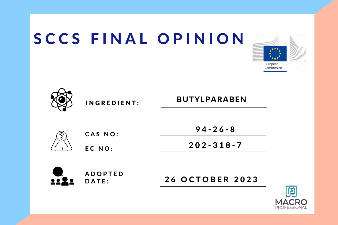 6 Kasım 2023’te SCCS, Butylparaben (CAS No. 94-26-8, EC No. 202-318-7) için nihai görüşünü yayınlamıştır. SCCS bu belgeyi 26 Ekim 2023’teki genel kurul toplantısında kabul etmiştir.