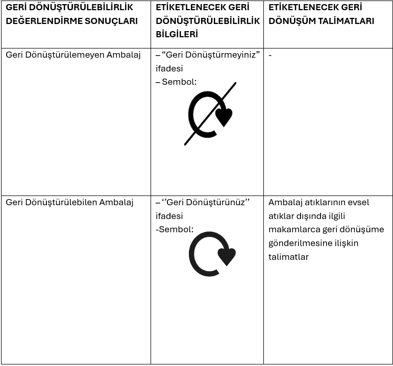 Ambalaj üzerinde etiketlenmesi gereken geri dönüşüm bilgileri, ambalajın geri dönüştürülebilirliğini gösteren bir ifade ve sembol ile ilgili geri dönüşüm talimatlarını içermektedir. Bu unsurların ambalaj üzerinde görünür ve okunaklı bir şekilde birlikte görünmesi şarttır. Bu unsurlar için ayrıntılı gereksinimler aşağıdaki tabloda sunulmuştur: