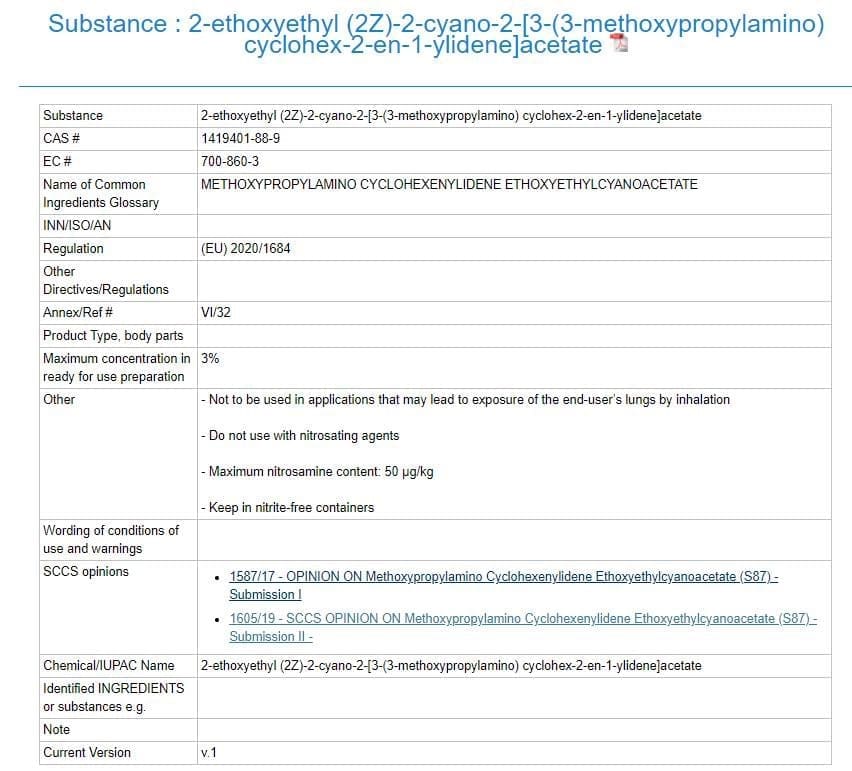 Tüketici Güvenliği Bilimsel Komitesi (SCCS) 13 Aralık 2019 tarihli görüşünde (SCCS/1605/19); Methoxypropylamino Cyclohexenylidene Ethoxyethylcianoacetate‘ın kozmetik ürünlerde maksimum % 3 konsantrasyonda UV filtresi olarak kullanılmasının güvenli olduğu sonucuna varmıştır.