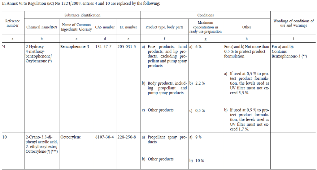 1223/2009 (EC) Sayılı Yönetmelik Ek VI’da, 4 ve 10 numaralı girişler yukarıda belirtilen veriler ışığında tabloda belirtildiği şekilde değiştirilmiştir: