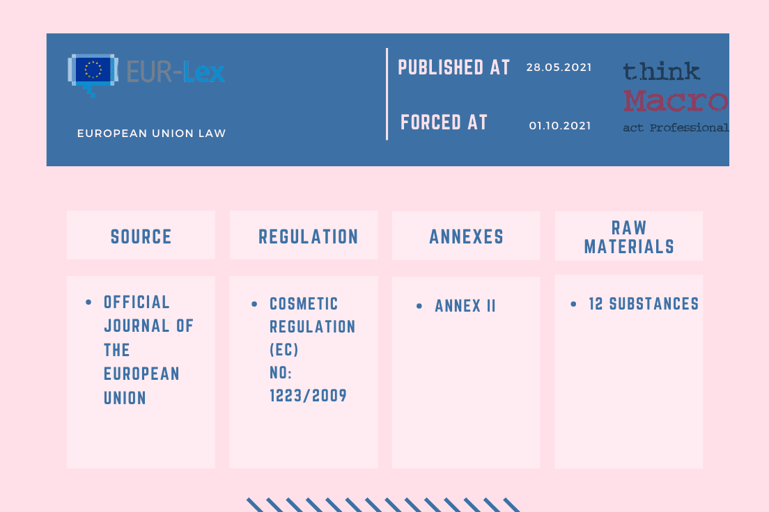 Avrupa Birliği Resmi Gazetesi’nde 28.05.2021 tarihinde Avrupa Parlamentosu ve Konseyi tarafından, kozmetik ürünlere ilişkin (EC) 1223/2009 Sayılı Tüzüğü Ek II’nin değiştirilmesi ve düzeltilmesi ve Ek III, IV ve VI’da değişiklik yapılması için bir yönetmelik yayımlanmıştır. Yayınlanmış olan bu yönetmelikte CMR olarak sınıflandırılan maddelerin yasaklanması veya düzenlenmesi amaçlanmıştır.