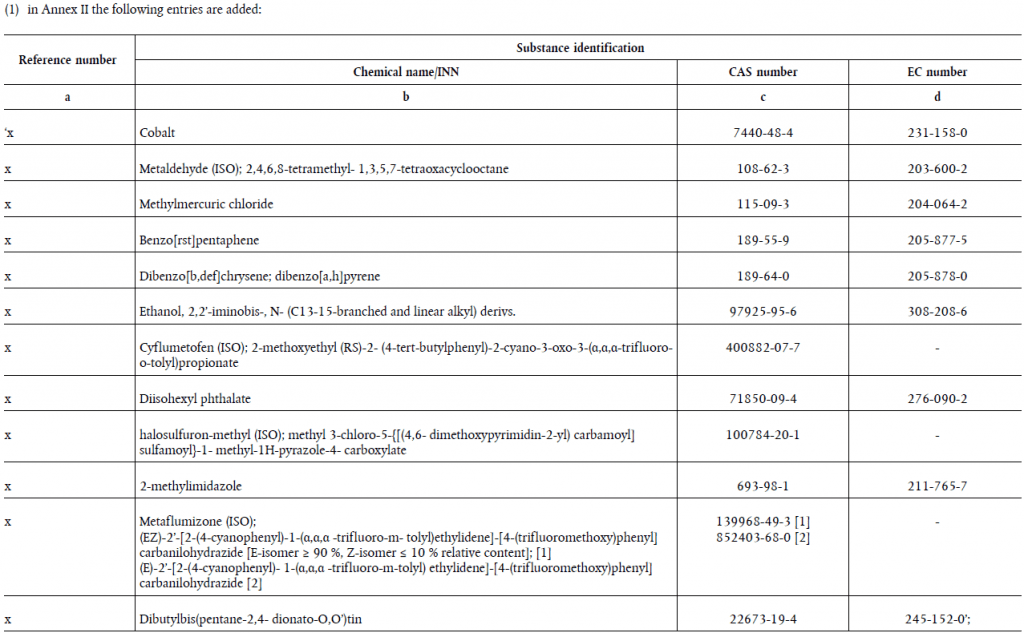 Ek olarak, nickel bis(tetrafluoroborate) (CAS numarası: 14708-14-6), 1223/2009 (EC) Sayılı Komisyon Tüzüğü (2019) Ek II’sinde (1401 ve 1427 girişleri) yanlışlıkla iki kez tanıtılmıştır. Bu girdilerin ikincisi bu nedenle gereksizdir ve kaldırılmalıdır.