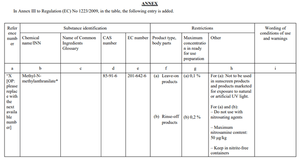 SCCS görüşleri ve bilimsel tavsiyeleri ışığında Avrupa Komisyonu, 1223/2009 Kozmetik Yönetmeliğini M-N-MA bileşeninin kullanımını kısıtlayacak şekilde değiştirme kararı almıştır. Bu değişikliğe göre M-N-MA bileşeni Kozmetik Yönetmeliği “Ek III – Sınırlamalar Dışında Kozmetik Ürünlerin İçermemesi Gereken Maddeler Listesi”’ne eklenecektir.