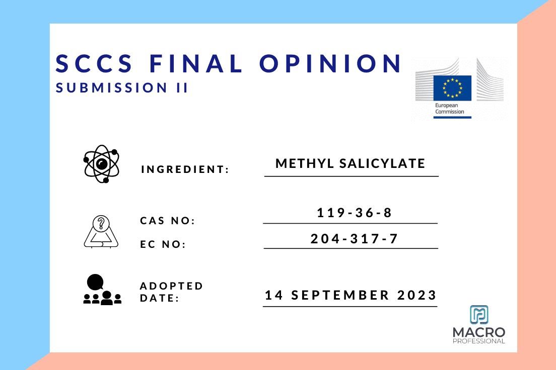 1223/2009 sayılı Kozmetik Yönetmeliği, 27 Ekim 2021’de SCCS, Methyl Salicylate’ın güvenliği konusunda karara varmış ve 2022/1531 sayılı Yönetmelik, ilgili bileşenin kozmetik ürünlerde kullanımını kısıtlamıştır. Methyl Salicylate halihazırda 1223/2009 Sayılı Kozmetik Yönetmeliği Ek III’ün 324. girişinde listelenmekte olup çeşitli ürün tipleri ve yaş grupları için spesifik konsantrasyon limitleri bulunmaktadır. Kasım 2022’de endüstri, oral ve oral olmayan ürünlerden Methyl Salicylate’a birleşik maruziyetin (MoS) yukarıda belirtilenlerin üzerinde olduğunu göz önünde bulundurarak çocuklara (0-3 ve 3-6 yaş grupları) yönelik kozmetik ürünlerde Methyl Salicylate kullanımını desteklemek için ek veriler sunmuştur. Bu nedenle Komisyon, sağlanan bilgiler ışığında SCCS’den Methyl Salicylate konusunda bir güvenlik değerlendirmesi yapmasını talep etmiştir.