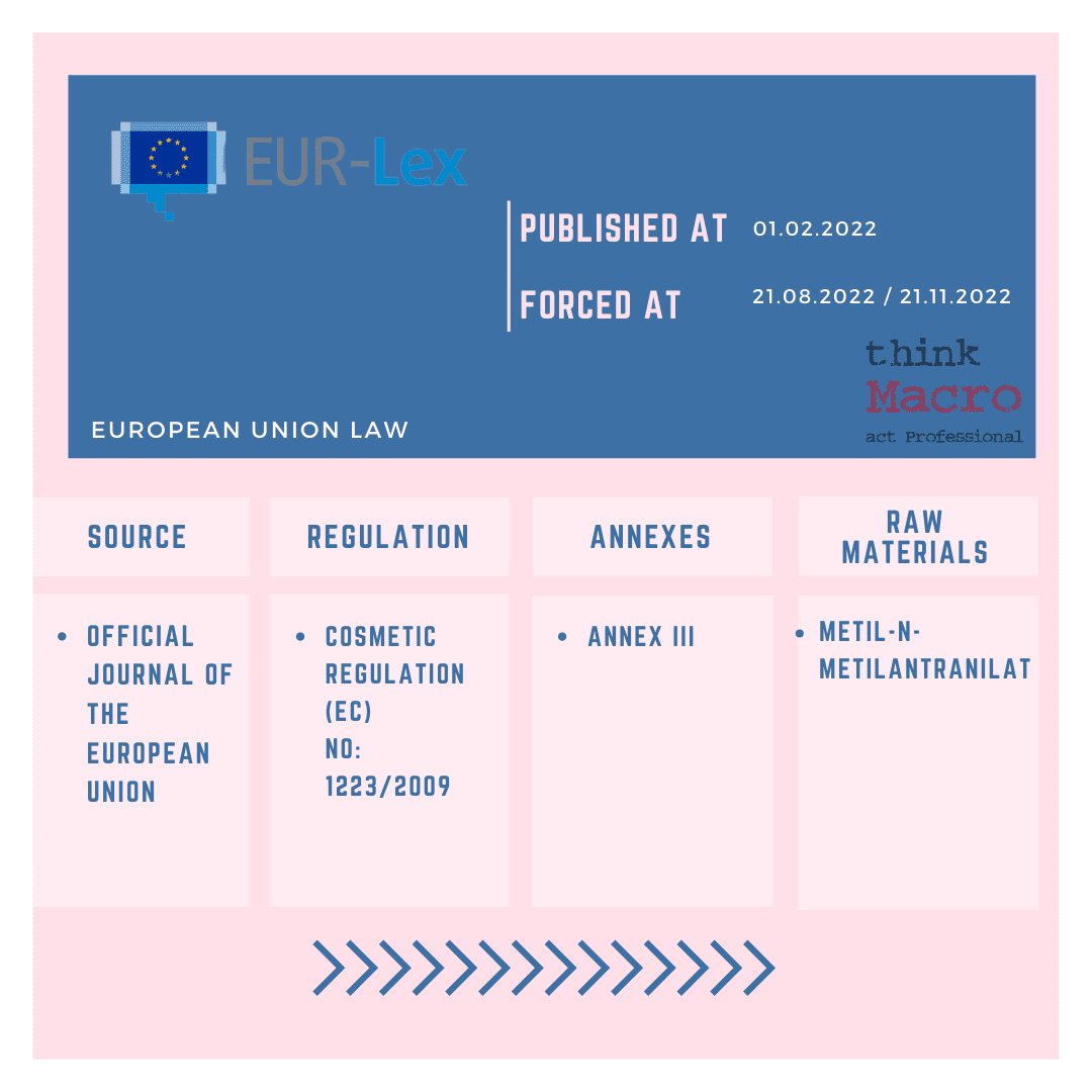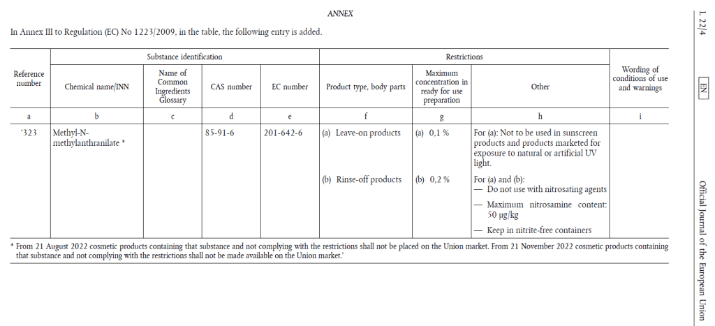 Kullanımına ilişkin duyuru yapılan Metil-N-metilantranilat maddesi (EC) 1223/2009 Sayılı Tüzüğün Ek III’üne eklenmiştir.