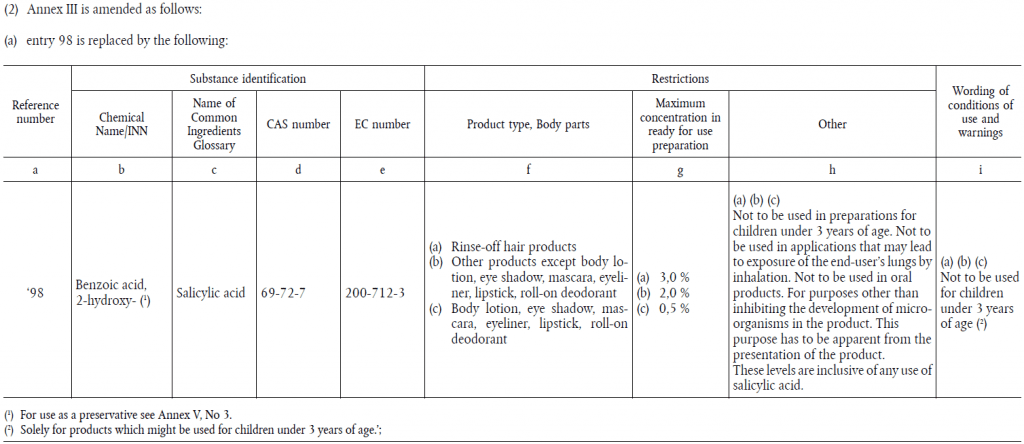 Salisilik asit daha önce 1223/2009 Sayılı (EC) YönetmeliğiEk V’inde (giriş 3); tüm kozmetik ürünlerde maksimum %0,5 konsantrasyona (asit) kadar kullanılacak koruyucu olarak listelenmiştir. Bunun yanında ayrıca Ek III’te (giriş 98) kozmetik durulanan saç ürünleri için maksimum %3,0 konsantrasyona ve diğer ürünler için %2,0’a kadar kullanılacak şekilde listelenmiştir. Her iki ekte de ‘’Şampuanlar hariç 3 yaşından küçük çocuklarda kullanılmamalıdır.’’ İbaresi geçerli olmuştur.