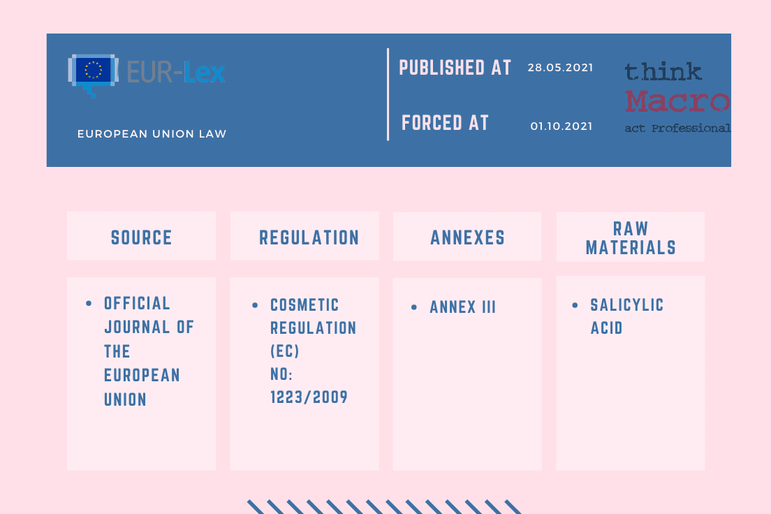 26 Mayıs 2021’de kabul edilen 2021/850 AB Komisyon Yönetmeliğinde; 1272/2008 Sayılı Tüzük (EC) uyarınca CMR olarak sınıflandırılan maddelerin yasaklanmasını tek tip olarak uygulamak için kabul edilen Komisyon Tüzüğü (AB) 2019/1966, Komisyon Tüzüğü (AB) 2018/1480, benzoik asit, 2-hidroksi- (INCI adı: salisilik asit) maddesiyle ilgili olarak 1223/2009 Sayılı (EC) Yönetmeliği Ek III’ ünün 98 numaralı girişine değişiklikler getirmiştir.