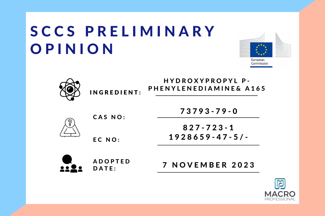 7 Kasım 2023 tarihinde SCCS, kozmetik ürünlerde kullanılan saç boyası Hydroxypropyl p-phenylenediamine ve onun dihidroklorür tuzu (A165) (CAS/EC No. 73793-79-0/827-723-1 ve 1928659-47-5/-) hakkında ön görüşünü yayınlanmıştır. Yorumlar için son tarih 8 Ocak 2024 olarak belirlenmiştir.