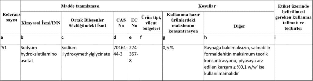 AB Resmi Gazetesi’nde 03.11.2021 tarihinde yayınlanan duyuruda (EC) 1223/2009 Sayılı Tüzüğü’nün Ek V’inde yapılan değişikliğin ardından, 16.11.2021 tarihinde TİTCK sayfasında yayınlanan duyuruya göre Kozmetik Tüzüğü Ek V’te SODIUM HYDROXYMETHYLGLYCINATE (SHMG) hammaddesi kullanımı için değişiklik yapılmıştır.
