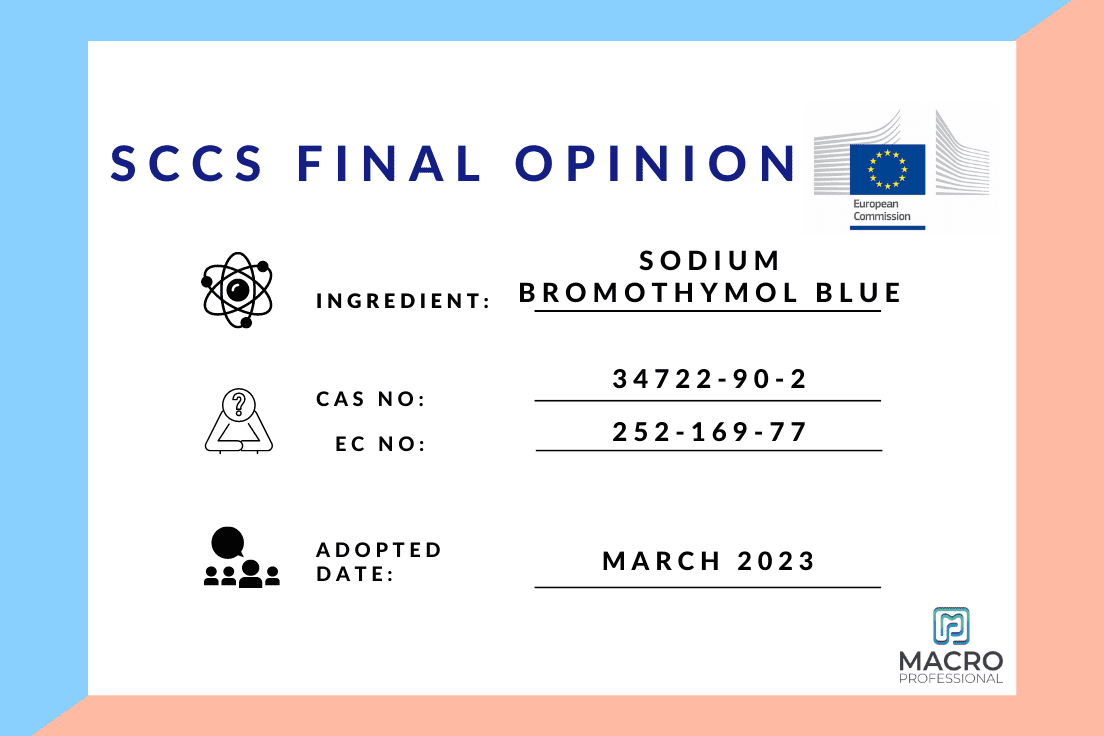 23 Mart 2023 tarihinde Tüketici Güvenliği Bilimsel Komitesi, saç boyası ürünlerinde kullanılan Sodium Bromothymol Blue’nun güvenliliği hakkındaki nihai görüşünü yayınlamıştır. SCCS, bu belgeyi 21-22 Mart 2023’te genel toplantı sırasında kabul etmiştir.