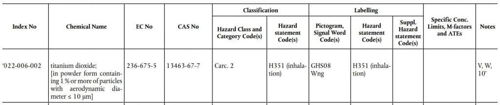 ECHA Risk Değerlendirme Komitesi’ nin 2017’ deki bilimsel görüşü, titanyum dioksiti inhalasyon yoluyla kanserojen – kategori 2 (CMR2) olarak sınıflandırmayı önermişti. Solunabilir titanyum dioksit partiküllerinin, akciğerler üzerinde birikmesinin akciğerde gözlemlenen toksititesinden ve ardından tümör gelişiminden sorumlu olduğu varsayıldı.